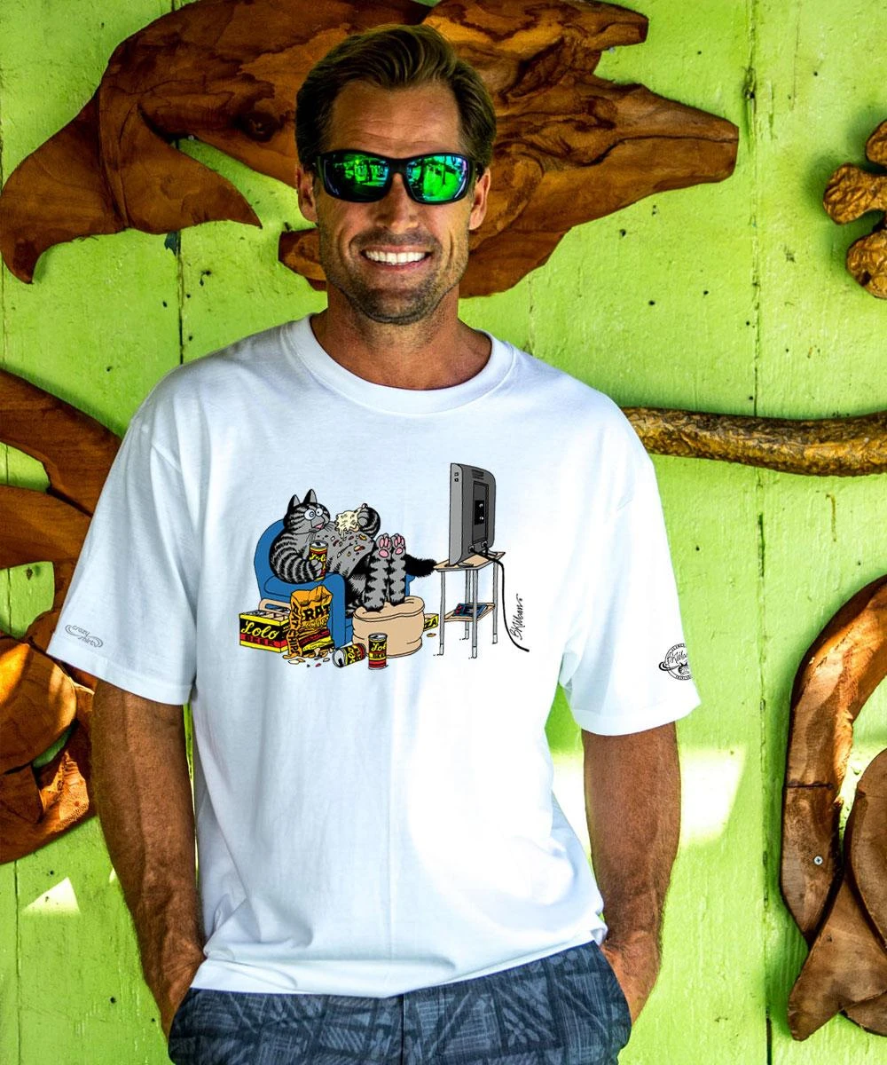 Have you tried Kliban and chill? These cats always put on a show even when they are relaxing in front of the tube. Made from 100% cotton that is ring-spun then combed to remove impurities, this fabric is luxuriously soft and lightweight yet incredibly strong. We only use environmentally friendly water-based inks that penetrate the material’s fiber resulting in more vibrant colors, softer feel and artwork that doesn’t crack or peel. Plus, it is proudly printed in the United States for quality you can see and designs-just like Kliban’s cats-that stand the test of time as well as the bond between Crazy Shirts and The Cat has endured for all these years.
