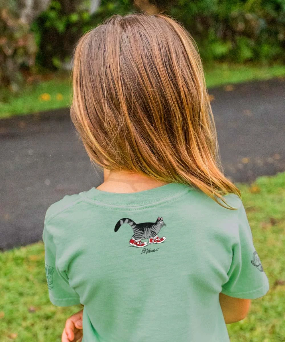 We get our kicks from the Kliban cats so it only seems fair that this feline has its own cool kicks to wear on all its paw-some adventures. A great way to put your best foot forward, this tee is a shoe-in to become your little one’s new favorite in no time flat. Made using our exclusive key lime specialty dyeing process and featuring 100% combed ring-spun cotton, this t-shirt has 50+ SPF protection to keep your keiki feeling cool, calm and protected all year long. We only use environmentally friendly water-based inks that penetrate the material’s fiber resulting in more vibrant colors, softer feel and artwork that doesn’t crack or peel. Plus, it is proudly printed in the United States for quality you can see and designs – just like Kliban’s cats – that stand the test of time as well as the bond between Crazy Shirts and The Cat has endured for all these years.