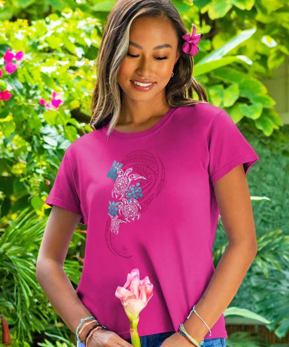 When it comes to smooth moves nobody has the sea turtle beat as these huge and heavy creatures seem to just slide through the water. Quilt squares and tribal designs add to their island essence in this berry colored creation that’s sure to put you in a state of flow. This fun, flirty tee remains extremely comfortable thanks to the relaxed fit. It’s also made from 100% cotton that is ring spun then combed to remove impurities for fabric that’s luxuriously soft and lightweight yet incredibly strong. The fine, ribbed tubular, continuous collar and tubular knit construction in the body adds durability. We only use environmentally friendly water-based inks that penetrate the material’s fiber resulting in more vibrant colors, softer feel and artwork that doesn’t crack or peel. Plus, it is proudly printed in the United States for quality you can see and designs that stand the test of time.