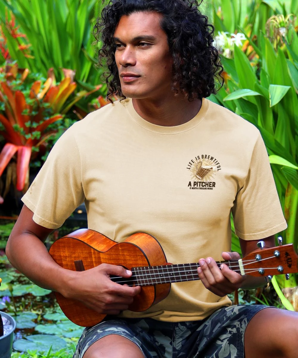 As this beer-dyed tee notes, A pitcher is worth a thousand words so let this shirt speak for you and your desire to say cheers to the good life. Made using our exclusive beer specialty dyeing process and featuring 100% combed ring-spun cotton, this t-shirt has 50+ SPF protection to keep you feeling cool, calm and protected all year long. We only use environmentally friendly water-based inks that penetrate the material’s fiber resulting in more vibrant colors, softer feel and artwork that doesn’t crack or peel. Plus, it is proudly printed in the United States for quality you can see and designs that stand the test of time.