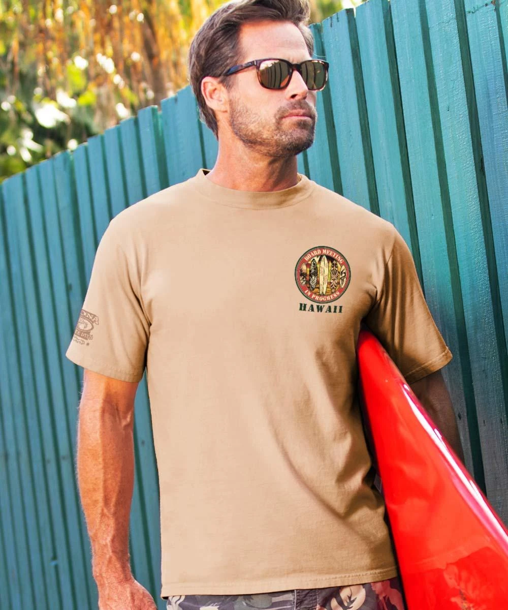 For Hawaiians, going to work can often mean hitting the surf. Embrace this way of life with this tee that’s both old school and new wave. Made using our exclusive Kona coffee specialty dyeing process and featuring 100% combed ring-spun cotton. This t-shirt also has 50+ SPF protection to keep you feeling cool, calm and protected all year long. We only use environmentally friendly water-based inks that penetrate the material’s fiber resulting in more vibrant colors, softer feel and artwork that doesn’t crack or peel. Plus, it is proudly printed in the United States for quality you can see and designs that stand the test of time.